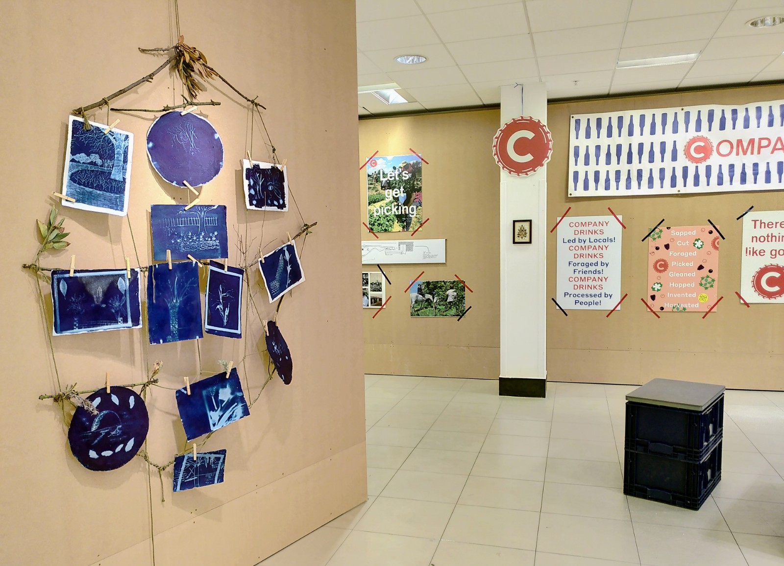 Exhibition space cyanotype prints from a community walk_workshop with Genevieve Rudd, and Company Drinks (image credit_Genevieve Rudd)