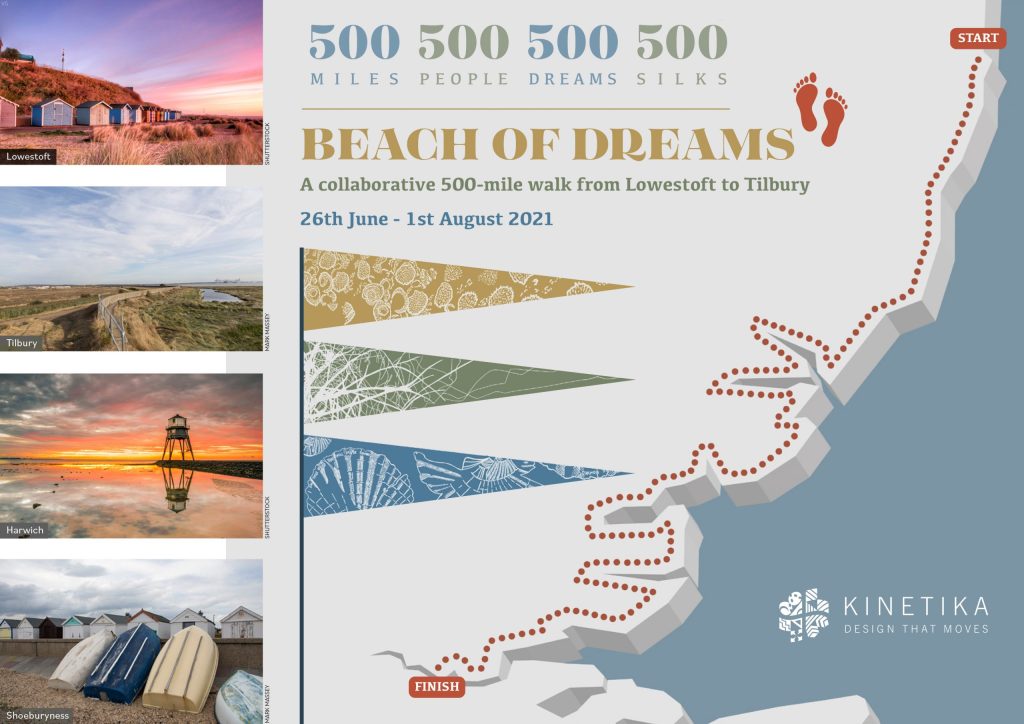 I’ve been playing a small role in a big project that will see 500 bespoke naturally-dyed silk flags being walked 200 miles along the east coast of England this summer. The Beach of Dreams project is led by Kinetika, an Essex based arts charity. I’ve had the pleasure of working with Kinetika for the last few years on community flag making projects in Norwich and Great Yarmouth, and this year, the pandemic has meant the project has been led differently, but with no lack of vibrant ambition!